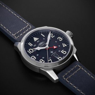 Dominantní trojúhelník na 12. pozici je typický prvek pilotních hodinek, který usnadňuje okamžitou orientaci i v náročných podmínkách.